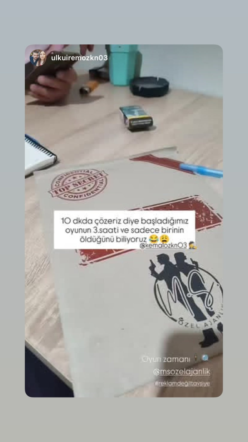 • 2 oyun sipariş verdim ve çok keyifle oynadık. Ajan kartları çok güzel düşünülmüş biz 6 kişi olduğumuz için iletişime geçtik 6 adet göndermişler çok düşünceli bir ekip ilgi alaka ve eğlence için teşekkür ederiz :)